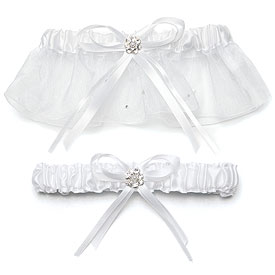 This beautiful white satin garter comes in a set of two. One has elegant white satin with white sheer decorated with white satin bow and rhinestones, the other is and elegant white satin garter with a satin bow and accented with a rhinestone. One size fits most.