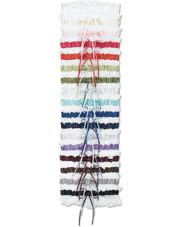 Choose from a variety of fashionable colors, for the Bridal "Toss" Garter. An elasticized colored ribbon band is trimmed with white lace and features a matching ribbon rose with rhinestone center and delicate bow.