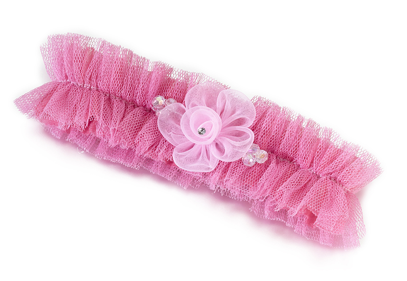 Tulle mesh make up this stunning leg garter. A mesh flower is decorated with crystal ornament. One size fits most. Available in Pink, blue/green and plum.