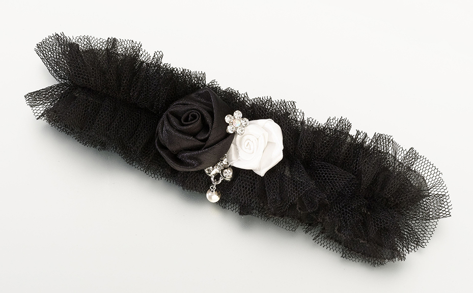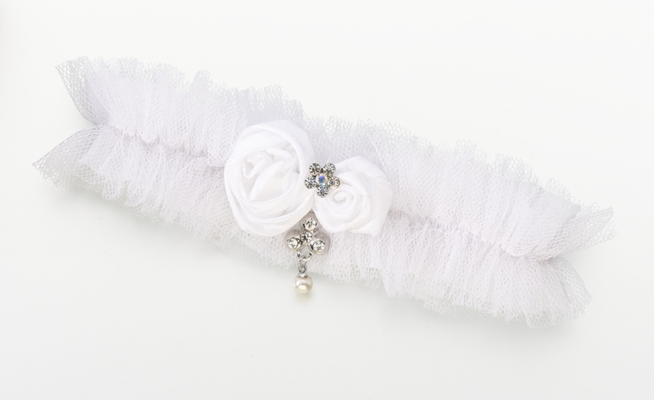 This tulle mesh make up this stunning leg garter. Satin roses in white flower is decorated with crystal ornament. One size fits most. Available in Ivory black and white.