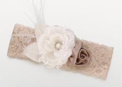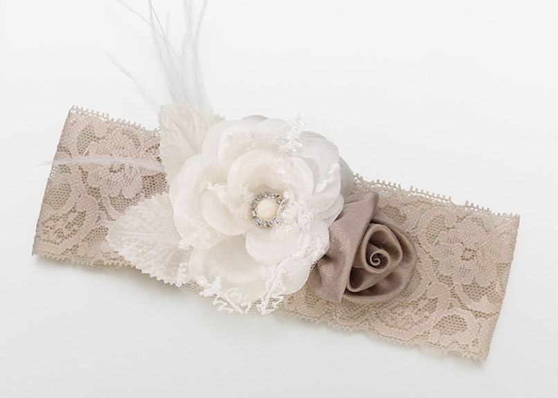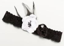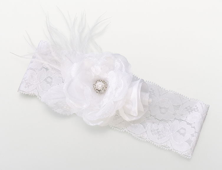 This sexy lace garter is made up of soft lace, feathers and two flowers and accented with a diamond gem. One size fits most. Available in white, black, blue, taupe and vintage blush.