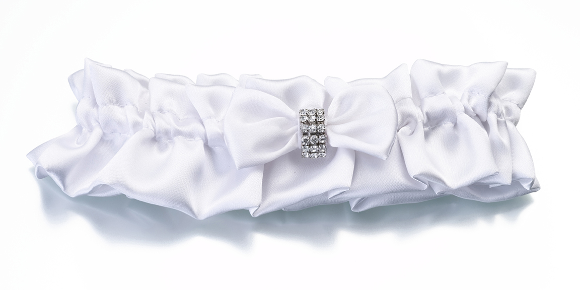 This beautiful white satin garter is touched off by a white satin bow with a rhinestone band. One size fits most.