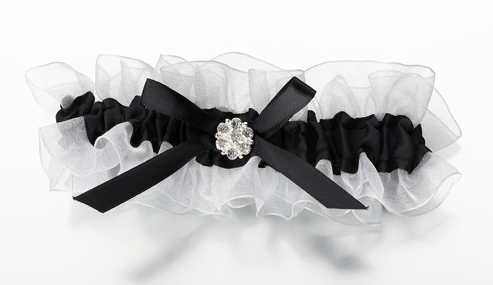 Satin and white sheer make up this elegant leg garter. A satin bow is decorated with a silver-plated rhinestone ornament. One size fits most.