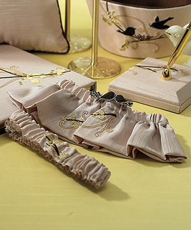 This charming Garter Set includes one “keepsake” garter and one to “toss,” and is inspired by the romantic nature of Love Birds. Two affectionate Love Birds and floral detailing adorn the keepsake garter and includes a charming brooch that can removed and worn as a lovely reminder of your wedding day. ITEM 9180