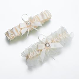 Dazzling crystals atop a layered satin bow creates a glamorous garter set with a true sense of style.