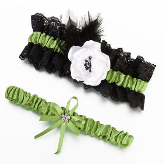 This beautiful garter set comes with two. One has elegant green satin and black lace decorated with black feather, white flower, the other is and elegant green satin garter with a satin bow and accented with a rhinestone flower. One size fits most.