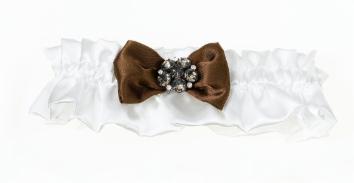 This cream satin leg garter is decorated with a brown satin bow and a circle ornament of light brown and clear rhinestones. One size fits most.