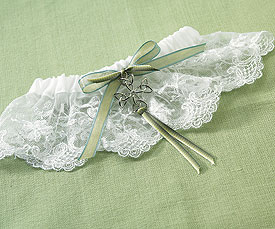 The Celtic Trinity Knot featured on the Celtic Charm Garter is attached with an olive and green ribbon. The garter also sports a delicate embroidered Irish lace bottom.