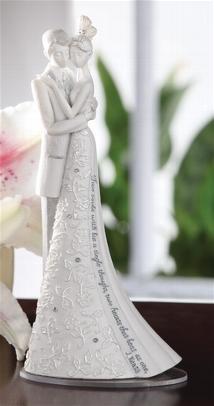 Every wedding cake needs a topper and this 9 cake topper is perfect. The resin/stone mixture ensures that it is durable and won't suffer damage before the wedding day. The verse, written in elegant script on the dress says: Now join your hands, and with your hands your hearts. -- Shakespeare