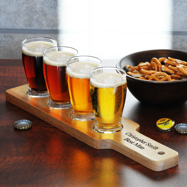 Custom Beer Flight Sampler may be engraved on the handle of the wooden