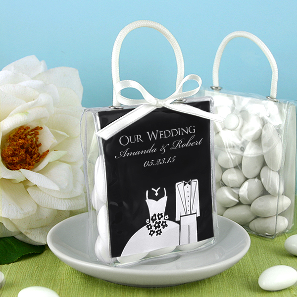 Pretty and petite, mini gift totes with personalized insert cards are perfect for those DIY favors. Fill these adorable clear gift totes (3"w x 3.5"h) with Jordan almonds, mints, Hershey’s Mini’s, M&M’s (match your event colors) lip balm, confetti or a special gift. You can line up these unique favor totes at a candy buffet. Or, in your guest’s hotel room, hang these adorable totes from a door handle with their unique rope handles.