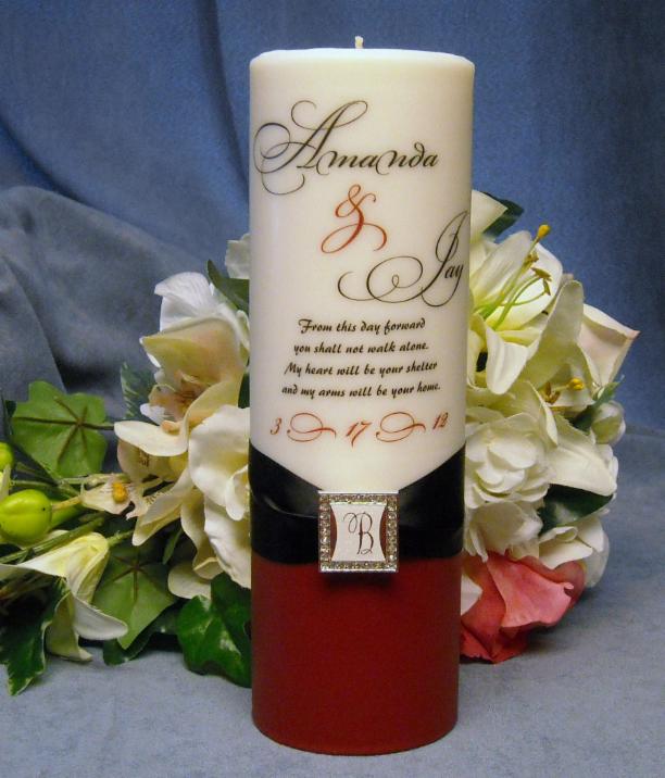 (Please note that the on the bottom the candle wax is dyed throughout not printed). The taper candle will be a solid white or ivory and can have either the names of the bride and groom or the last names of the families. Date only printed as shown in picture.