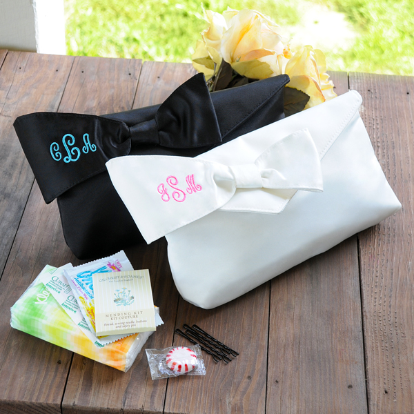 The Bridesmaid Clutch with Survival Kit may be embroidered with a monogram or single script initial in light pink, medium pink, light orange, orange, red, aqua, apple green, light blue, light purple, lavender, sage, Caribbean, white or grey/silver thread at No Additional Cost.Allow 14 Days for production