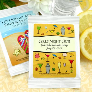 Whether your bridal tastes sway to the beaches of the Caribbean or the nightclubs of New York City, we have both the cocktail mix and packaging to meet your wedding favor needs. A wide range of exciting package designs is available to suit every couple’s personality and wedding theme. Each single serving of drink mix comes sealed in a beautiful white gloss pouch (3.75"w x 5"h) that contains 11 grams of the powder drink mixture. Instructions are on the back on how to mix the pouch contents with other ingredients to form the perfect cocktail. All designs can be personalized with the name of the bride and groom and the wedding date.the labels are included in self sticking sheets for you to easily apply. Allow 10 business days for production