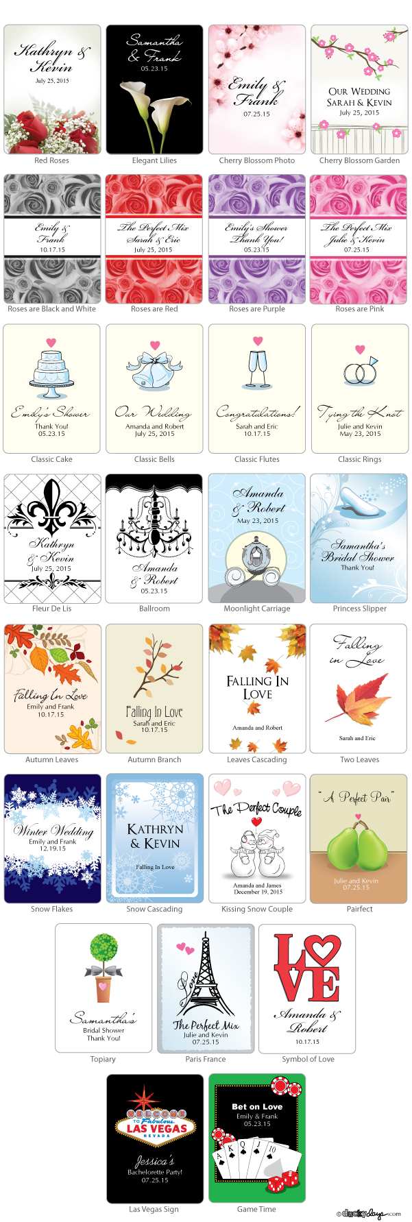 All designs can be personalized with the name of the bride and groom and the wedding date.the labels are included in self sticking sheets for you to easily apply. Allow 10 business days for production
