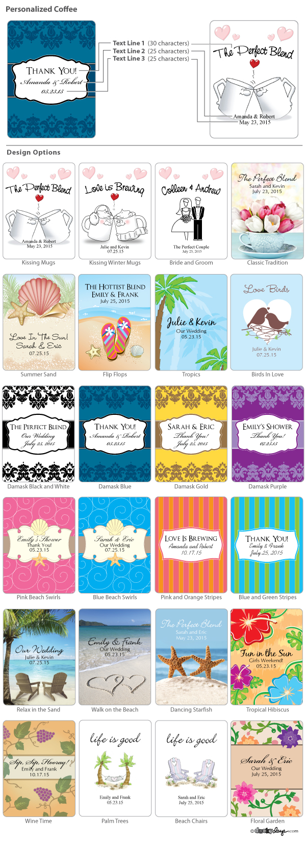 Elegant and glamorous, the color silver imparts a feeling of luxury. Sophisticated and classic, silver adds a bit of sparkle and shimmer to any season, occasion, or party theme. Bringing that sterling look to your event is a snap with our silver coffee packets. Personalize each packet with a design that suites your style and showcases your personality for a fantastic gourmet favor.
