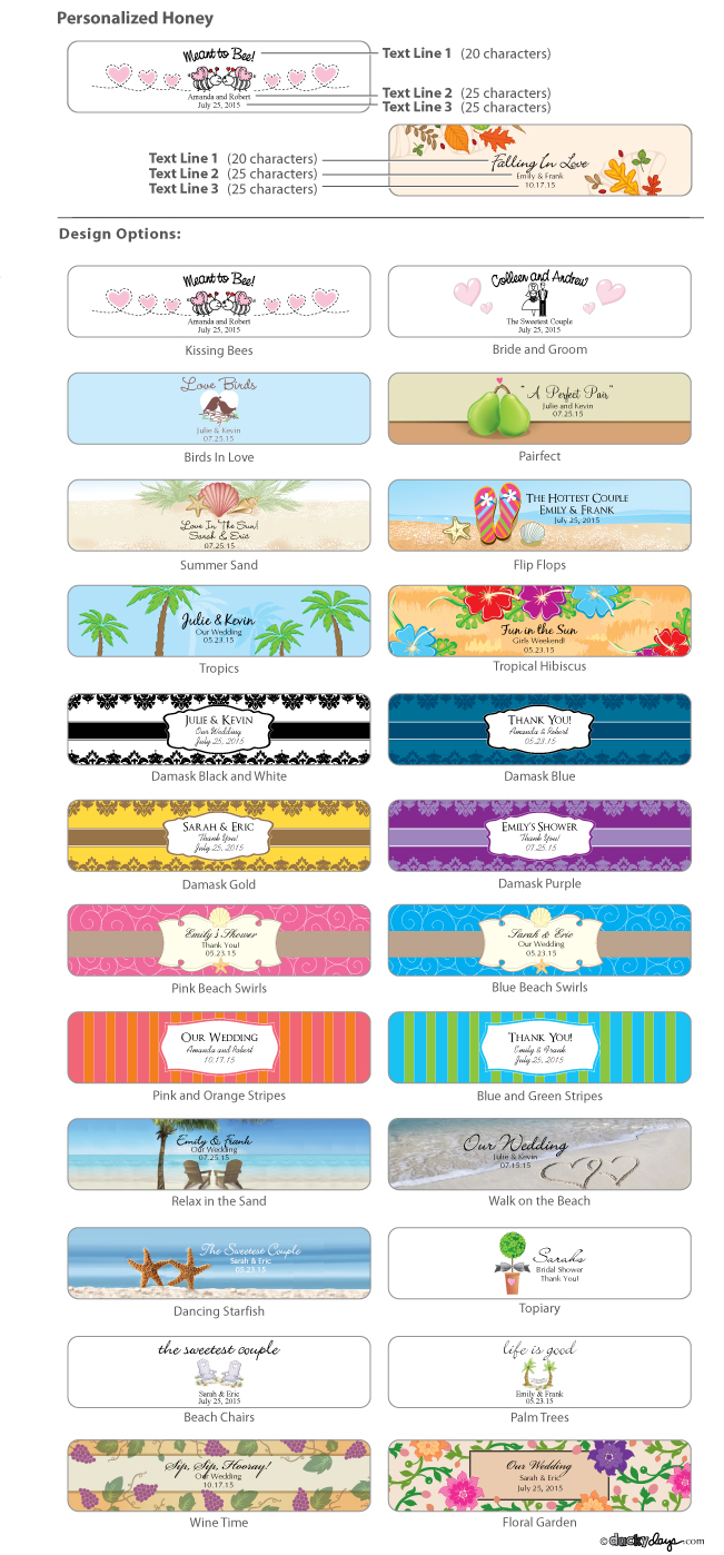 The Wedding Honey Collection™ is available in several beautiful, high-quality color designs coordinated with the Wedding Tea & Coffee Collection™ products. All styles can be personalized with the name of the bride and groom and the wedding date. the labels are included in self sticking sheets for you to easily apply. Allow 10 business days for production