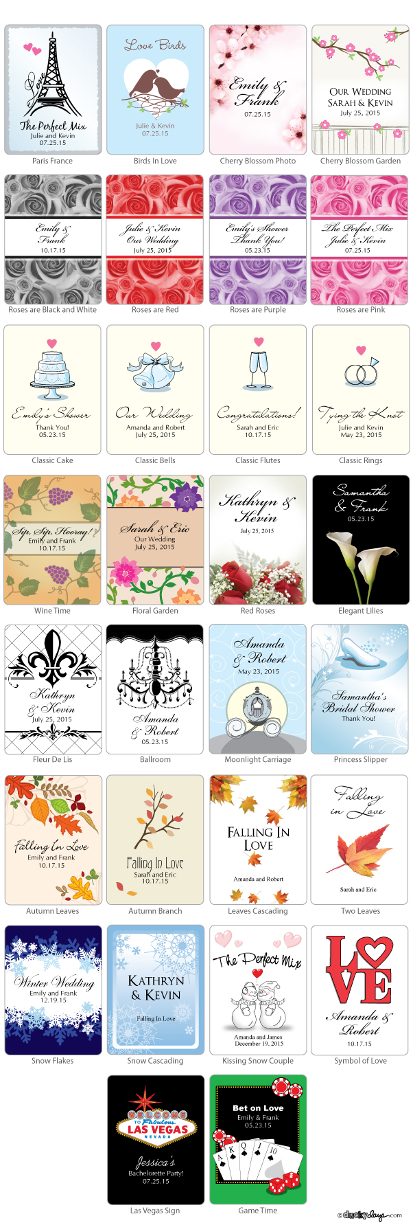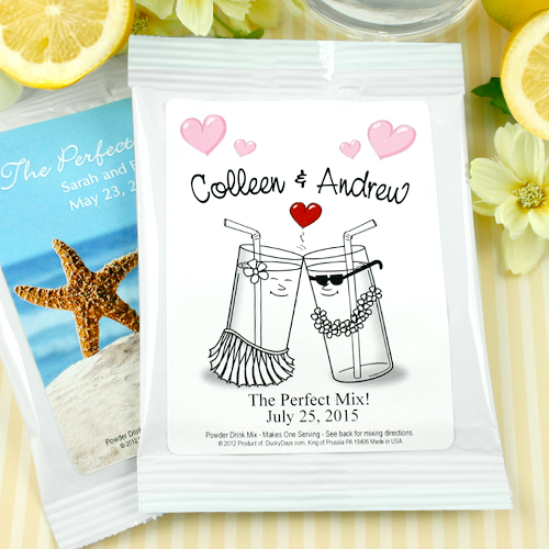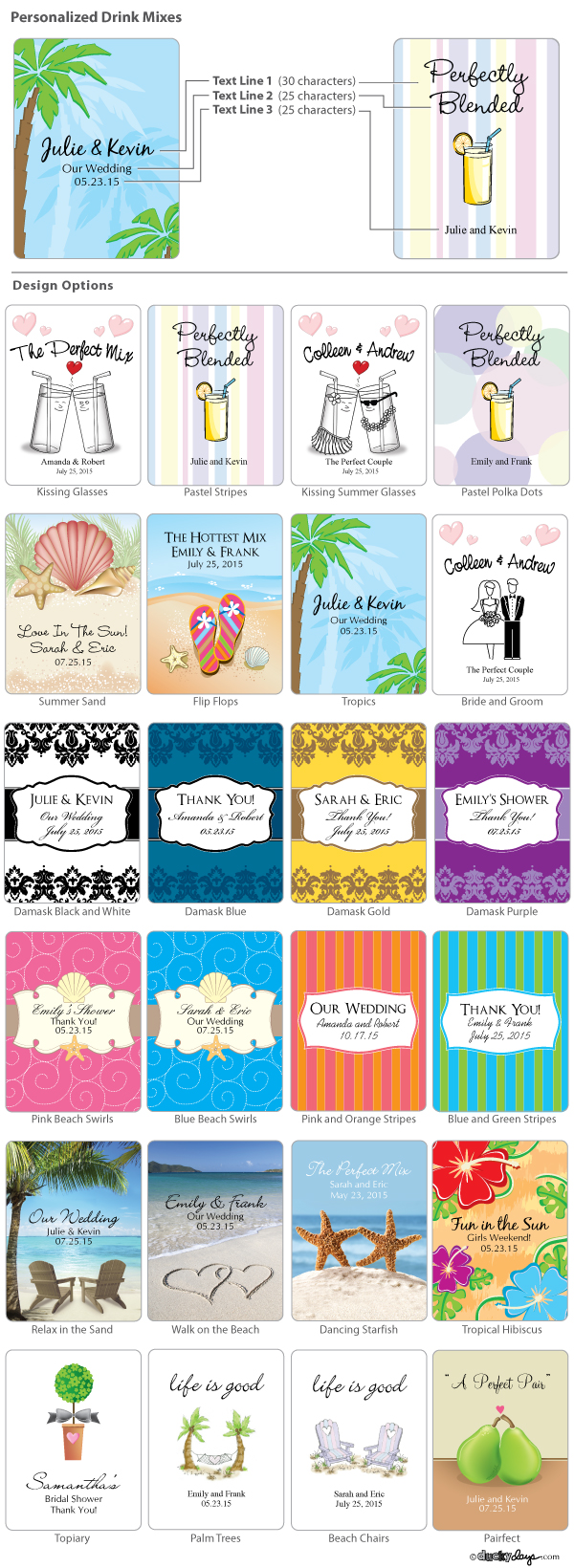 Each single serving of drink mix comes sealed in a beautiful white gloss pouch (4"w x 5.5"h) that contains 1 ounce of the powder drink mixture. Instructions are on the back on how to mix the pouch contents to create a delicious drink. All designs can be personalized with two lines of text.the labels are included in self sticking sheets for you to easily apply. Allow 10 business days for production