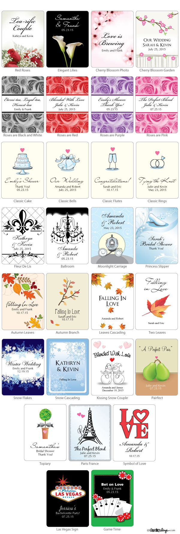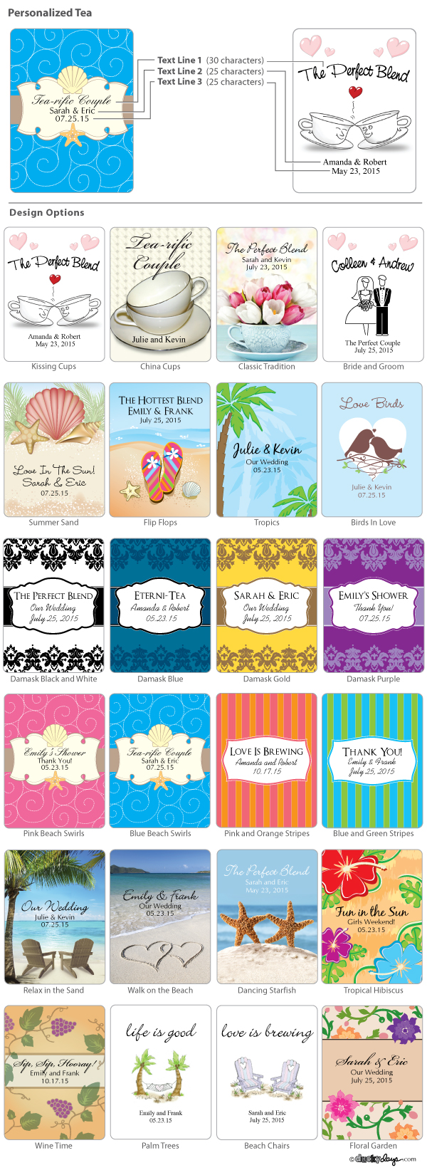 The Wedding Tea Collection™ offers brides and grooms a stylish, personalized wedding favor at a great low price. Allow your guests to enjoy a warm, relaxing cup of tea while reminiscing about your wedding. The Wedding Tea Collection™ provides a rich, traditional blend of black tea producing a robust, satisfying brew. Each tea bag comes sealed in a beautiful white gloss foil envelope (2.5"w x 3"h) to lock in the flavor and freshness. All designs can be personalized with the name of the bride and groom and the wedding date. the labels are included in self sticking sheets for you to easily apply.