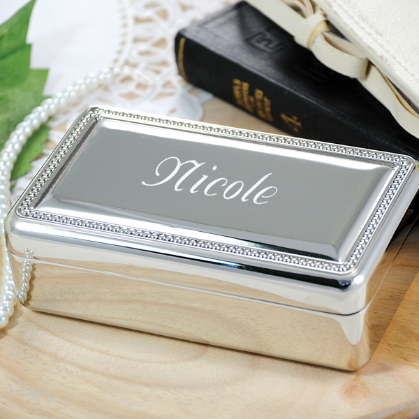 The Beaded Silver Jewelry Box may be engraved with up to three block initials, interlocking script monogram or script name (max of 14 characters) at No Additional Cost.