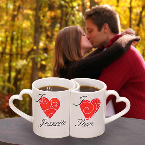 The Personalized Heart Mugs may each be engraved with a single script first name (max of 12 characters per name) following an accompanying "I" and red heart design at No Additional Cost. *Please Note: To ensure that mugs will be engraved correctly, you will enter the female name first and male second.