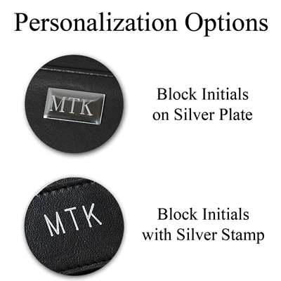 The Genuine Leather Money Clip may be personalized with up to three block initials on a silver plate or with a silver stamp at No Additional Cost. Silver stamp is on magnetic money holder. Silver plate has adhesive backing for placement of your choice upon arrival.