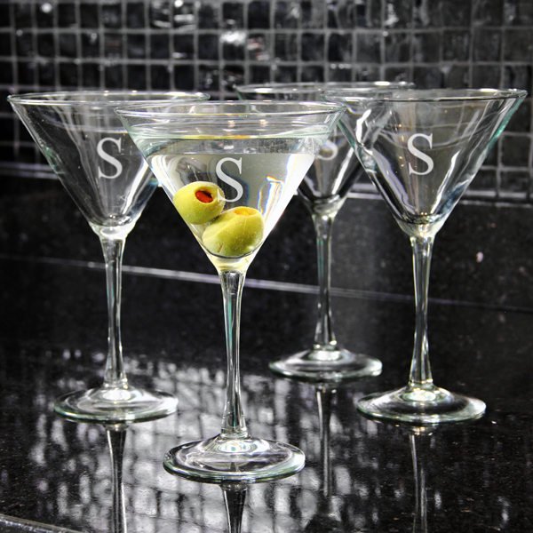 Features: classic martini shape, weighted bottoms and custom engraved initials on each glass