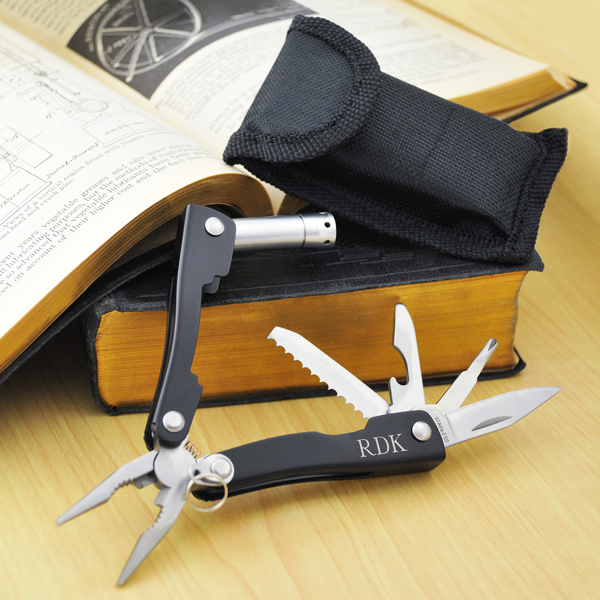 The Multi Tool with Flashlight may be engraved with up to 3 block initials at No Additional Cost.