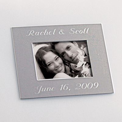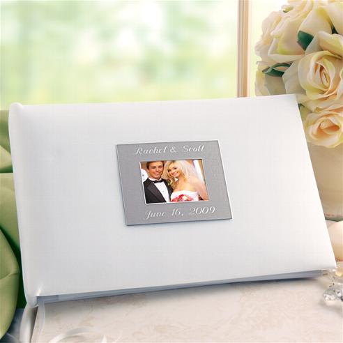 The Personalized Photo Guest Book may be engraved with two first names and wedding date or two custom lines (max of 20 characters per line) on a silver plate at No Additional Cost. Silver plate has adhesive backing for placement of your choice upon arrival.